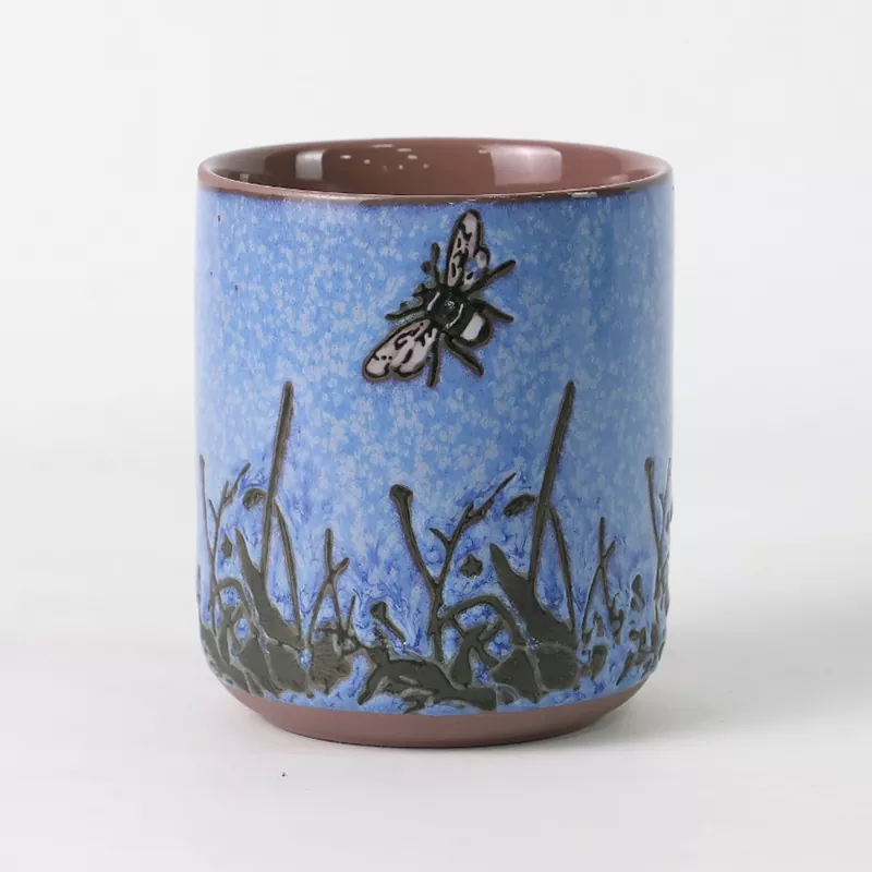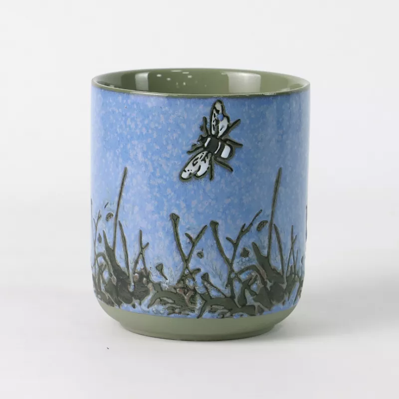 इन्सेक्ट-पॅटर्न सिरेमिक कँडल होल्डर मालिका "कॉर्डीसेप्स सिम्बायोसिस" च्या नैसर्गिक प्रतिमेपासून प्रेरणा घेते, ज्यात शास्त्रीय पूर्व सौंदर्यशास्त्राचे सार आणि तारांकित आकाशाचे गूढ सौंदर्य टिपले जाते. हे हाताने रंगवलेल्या अंडरग्लेज सजावटीसह उच्च-तापमान भट्टीवर चालवलेल्या ग्लेझचे मिश्रण करते, शेवटी तीन स्वाक्षरी रंग तयार करण्यासाठी डझनभर समायोजन आणि सुधारणा केल्या जातात: स्टाररी नाइट ब्लू, मिस्टिक ग्रीन आणि डीप इंडिगो. कपाची बाहेरची भिंत सुरेख सोन्याचे चपळांनी शिंपडलेल्या विस्तीर्ण तारामय आकाशासारखी दिसते, जणू आकाशगंगेचे तेज तुमच्या हाताच्या तळहातावर आहे; आतील भिंत शुद्ध चकाकी वापरते, आरशाप्रमाणे स्वच्छ, बाहेरील तारामय आकाशाच्या पोतसह एक मजबूत दृश्यमान कॉन्ट्रास्ट तयार करते, प्रकाश आणि सावलीच्या परस्परसंवादात कल्पकता दर्शवते. हाताने रंगवलेले फुलपाखरू, गवताचे स्टेम आणि तळाशी पिवळ्या रंगाची फूले येणारे रानटी फुलझाड नमुने, अनुभवी कारागिरांनी बारकाईने रचलेले, जिवंत आणि चैतन्यशील आहेत, जीवनाच्या चक्राची आणि निसर्गाच्या सहजीवनाची चिरंतन कथा सांगत आहेत. प्रत्येक कप हे कलेचे एक अद्वितीय कार्य आहे, निसर्गाबद्दल आदर आणि जीवनाचा उत्सव आहे.