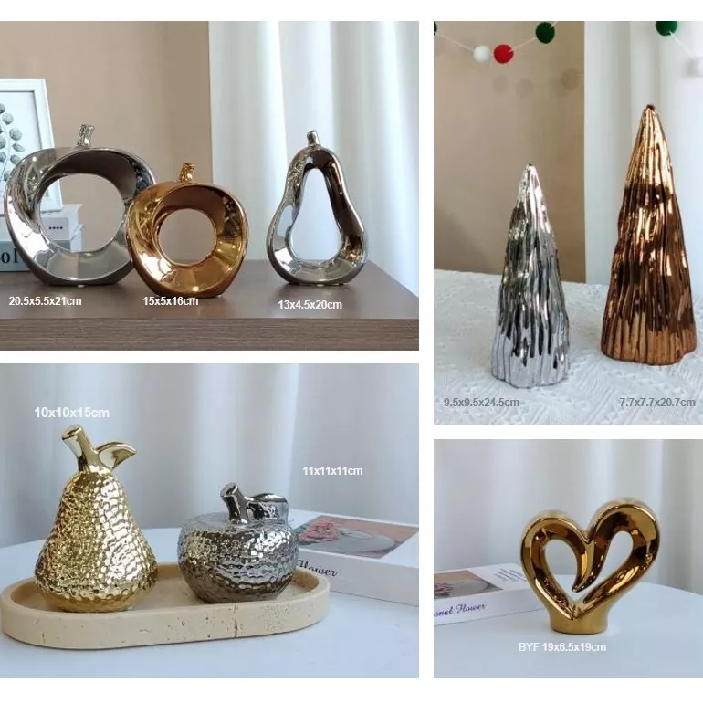बीवायएफच्या विशेष सिरेमिक सजावटमध्ये फळ, ख्रिसमस झाडे आणि अंतःकरणे आहेत. सिरेमिकने बनविलेले, ते मेटलिक शीन तयार करण्यासाठी एक अद्वितीय तंत्र वापरतात, जे सोन्याचे आणि चांदीमध्ये उपलब्ध आहेत. फळांच्या डिझाइनमध्ये (सफरचंद आणि नाशपाती) अनन्य कटआउट्स आणि पोतसह गुळगुळीत रेषा वैशिष्ट्यीकृत करतात; ख्रिसमस ट्री त्रिमितीय आहे, समृद्ध पोतसह; आणि हृदय सोपे आणि मोहक आहे, रोमान्सचा स्पर्श देते. हे मोहक, हलके-लक्झरीचे तुकडे आपल्या लिव्हिंग रूममध्ये किंवा टेबलसाठी योग्य आहेत, आपल्या घरात कलात्मक स्वभाव आणि शैलीचा स्पर्श जोडतात. ते परिष्कृत अ‍ॅक्सेसरीज आहेत जे कोणत्याही जागेचे वातावरण वाढवतात.
